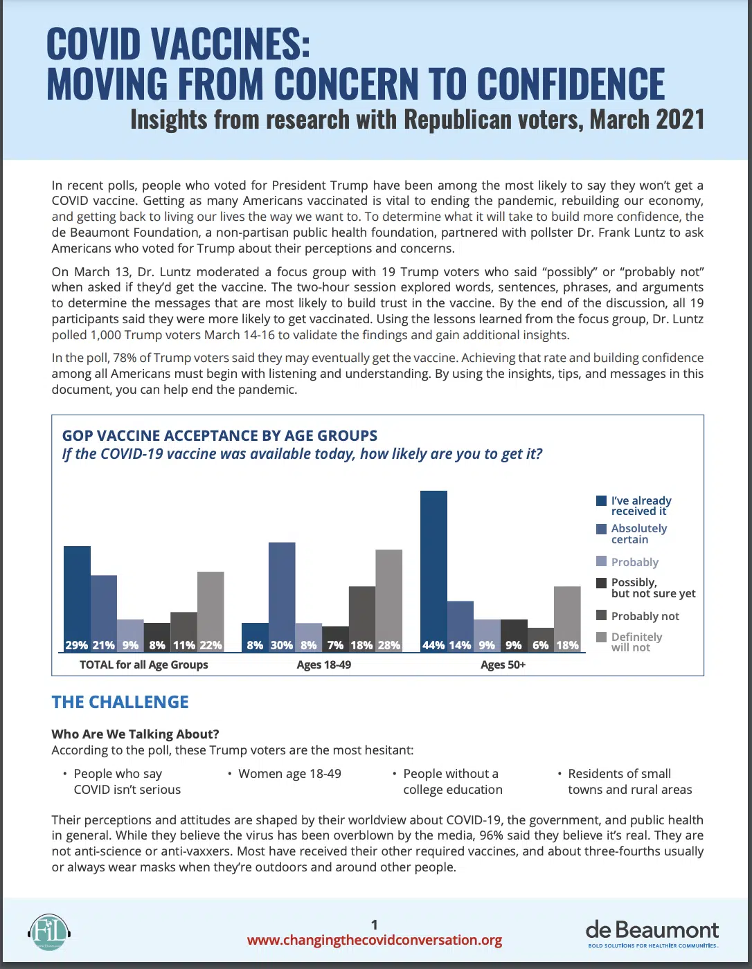The poll questions were informed by a March 13 nationwide focus group with 19 Trump voters who said they may “possibly” get a COVID vaccine or “probably would not.” Conducted by Frank Luntz on March 14-16 for the de Beaumont Foundation — in partnership with United States of Care and Resolve to Save Lives, an initiative of Vital Strategies — the poll identifies specific language that can help build confidence in the vaccines for all Americans. Findings include messages about the safety and effectiveness of the vaccines, the potential long-term effects of COVID-19, and the careful review process that each vaccine has followed.