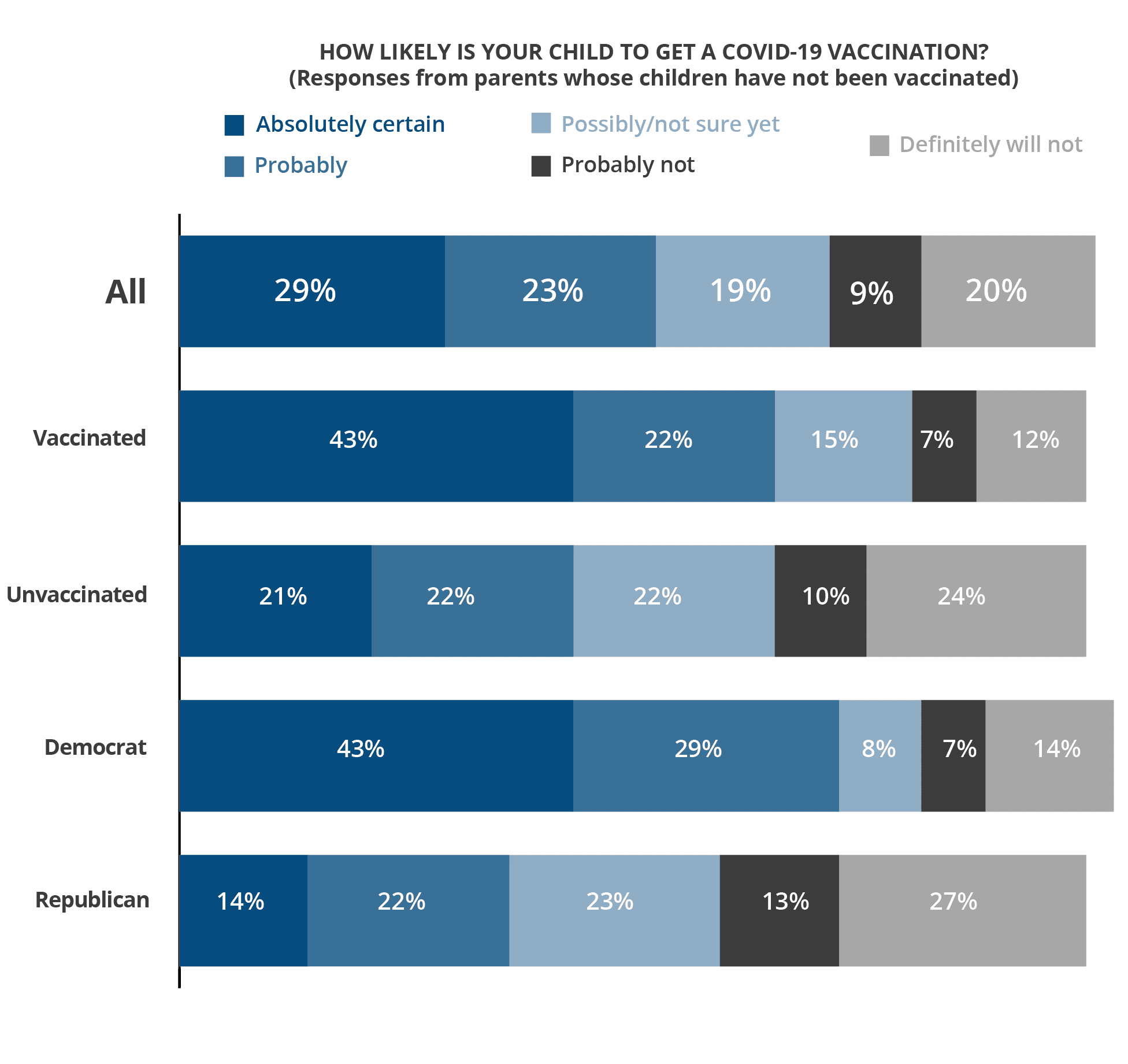 The findings show that parents are very concerned about the Delta variant, and its spread across the country makes them more likely to get their children vaccinated. Nationally, 76% said the Delta variant increases the likelihood of their children getting a COVID vaccine, including 48% who said โmuch more likely.โ Critically important, that includes 68% of parents who are unvaccinated and 66% who are self-identified Republicans.