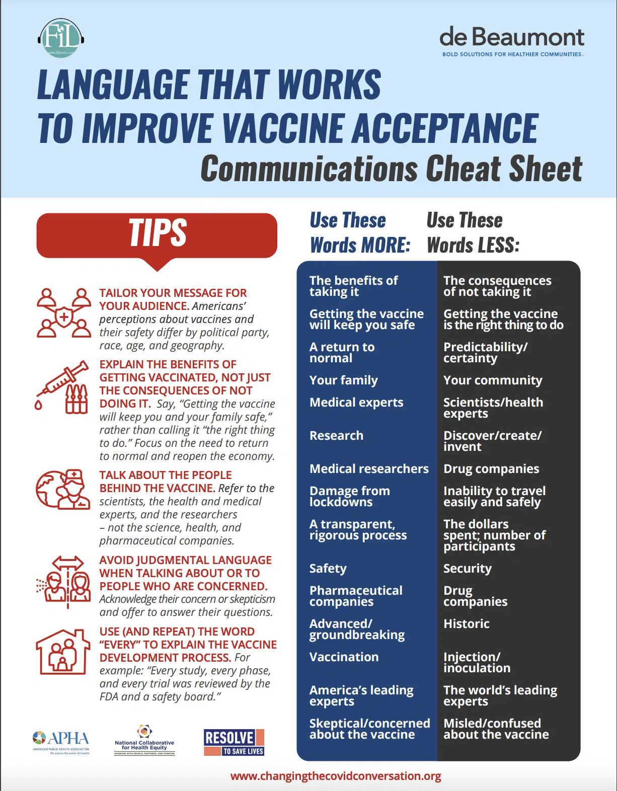 “Words can save lives. Our ability to boost confidence in COVID-19 vaccines will depend largely on the language, the messengers, and methods we use to communicate to Americans that the vaccine will help keep them and their families safe and healthy.” -Dr. Brian C. Castrucci, President and CEO, de Beaumont Foundation