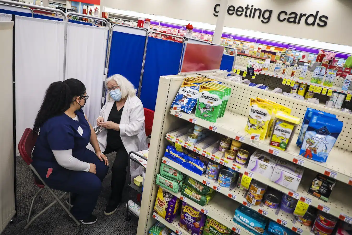 CVS Pharmacy Technician Leslie Carnejo, left, talks to RN Claire Karas after receiving the COVID-19 vaccine at a CVS in Boston. CVS Health, which administers covid vaccines as part of the federal pharmacy distribution program, says it strongly encourages the shots for its employees “from a public health standpoint” but won’t mandate them. (Erin Clark / The Boston Globe via Getty Images)