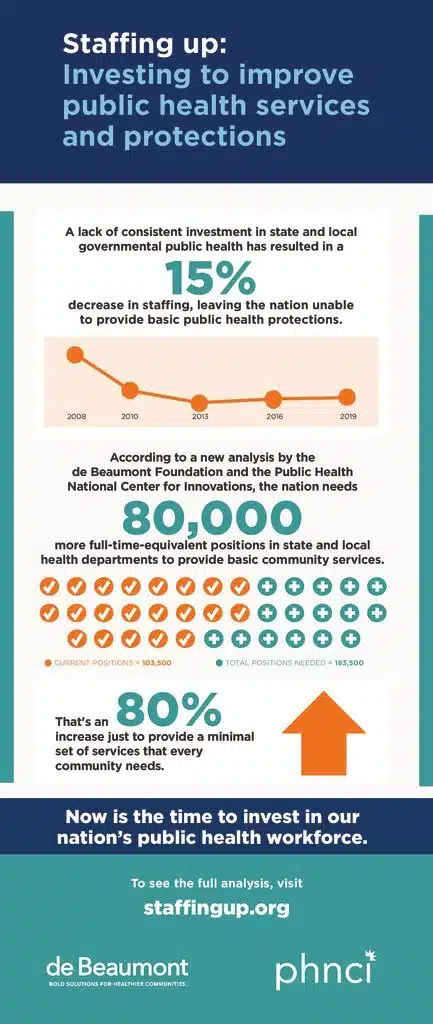 “This estimate is an important starting point for the national discussion we need to have about the value of public health, prevention, and preparedness,” said Brian C. Castrucci, DrPH, president and CEO of the de Beaumont Foundation. “Increasing the workforce by approximately 80% is a relatively small investment to ensure that every community has basic public health services.”