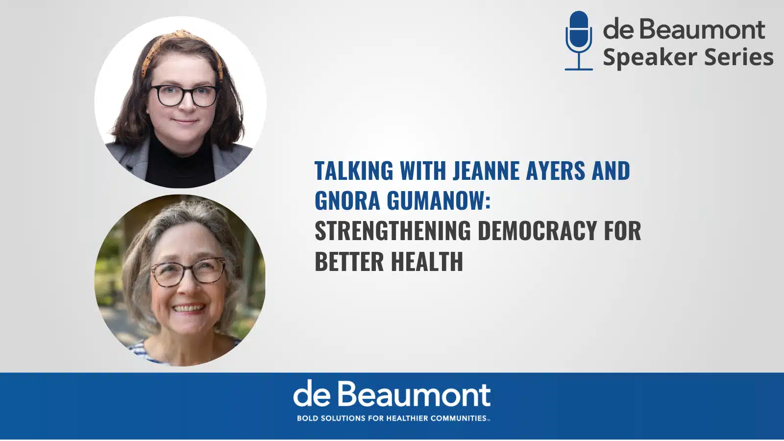 Ayers and Healthy Democracy Healthy People Partnerships Director Gnora Gumanow, MPH, talked to de Beaumont Foundation staff about how a strong democracy leads to better health outcomes. The following highlights from the conversation have been edited for length and clarity.