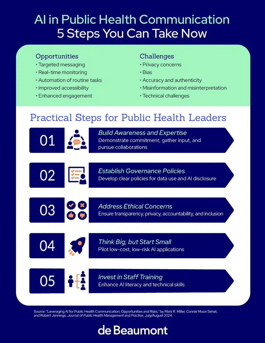 AI presents unprecedented opportunities for public health executives to enhance communication effectiveness, engage diverse audiences, and address complex health problems. By carefully considering the challenges of AI usage, identifying opportunities for improvement, and taking practical steps to leverage AI responsibly, public health agencies can maximize the potential of AI to advance health outcomes in their communities.