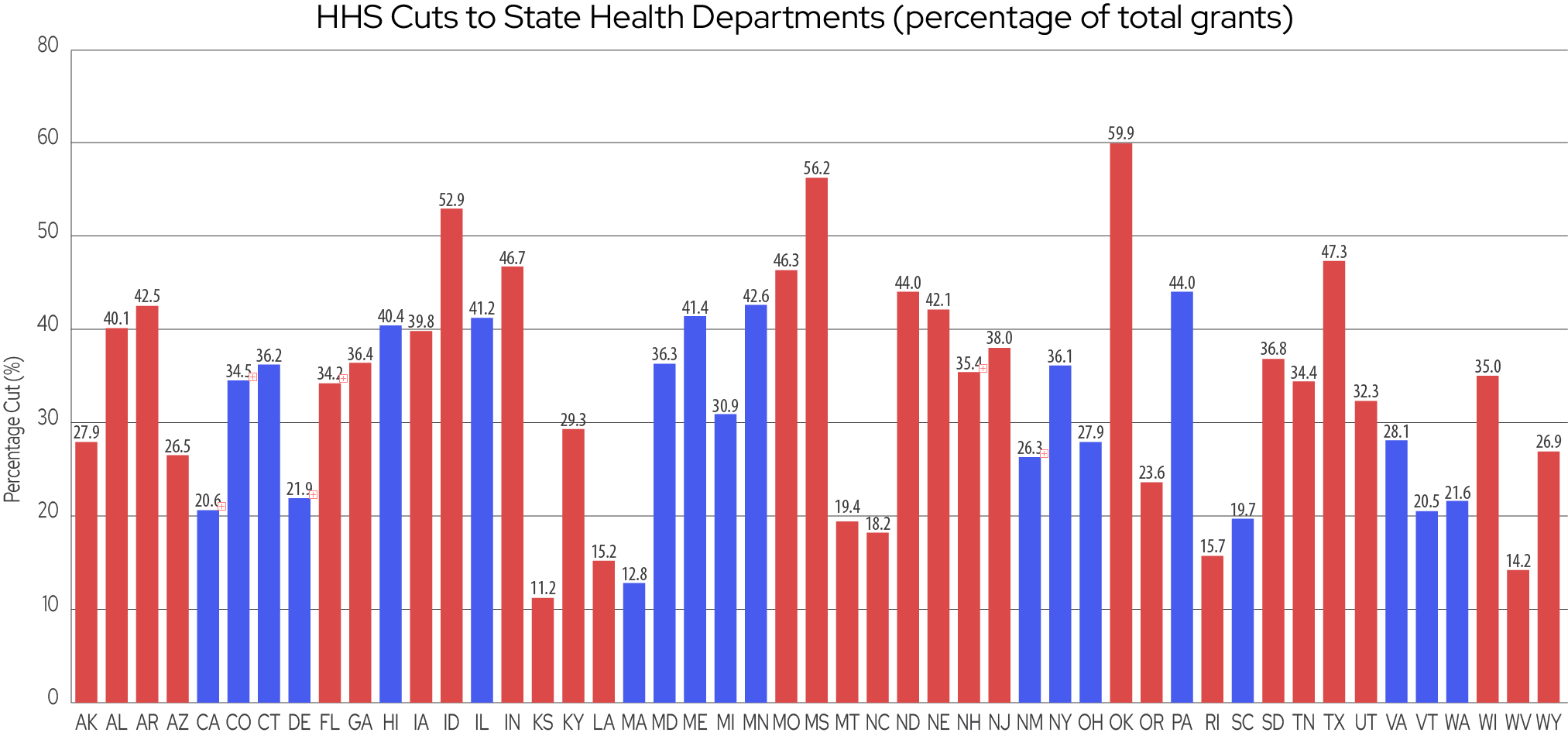 SOURCE: de Beaumont analysis of data from the Department of Government Efficiency (doge.gov/savings). The red bars indicate states that President Trump carried; states that Vice President Kamala Harris carried are blue.
