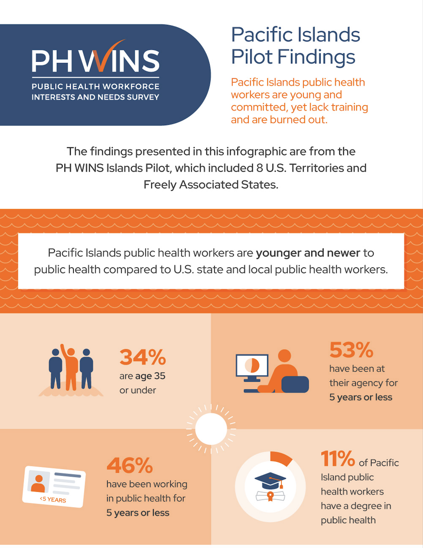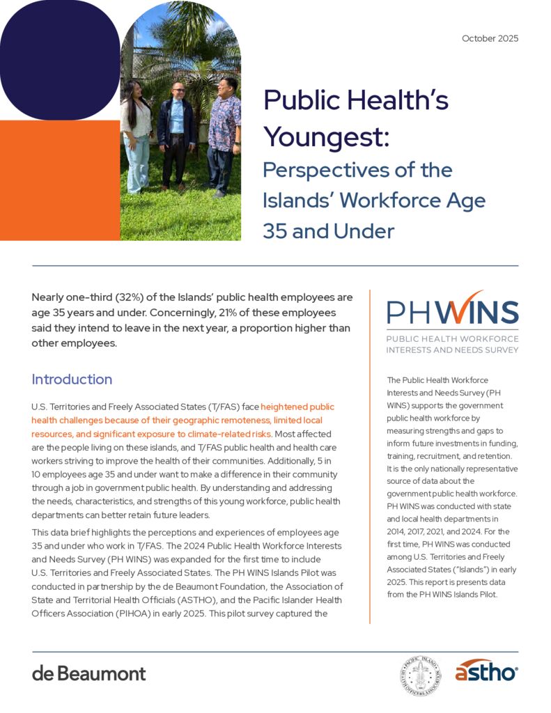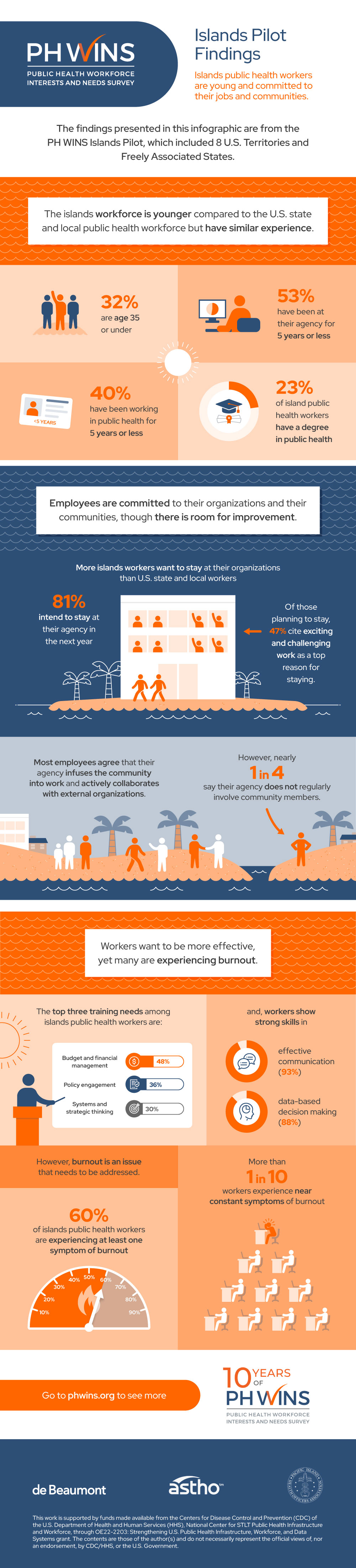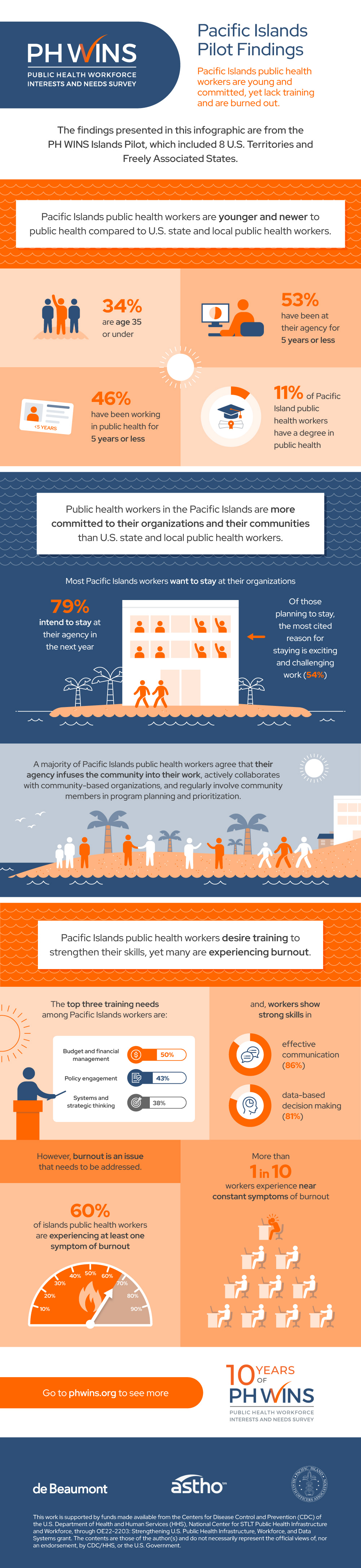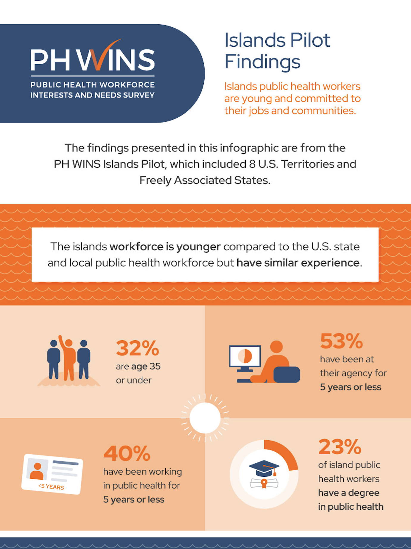 The Public Health Workforce Interests and Needs Survey (PH WINS) Islands Pilot was conducted by the de Beaumont Foundation, the Association of State and Territorial Health Officials (ASTHO), and the Pacific Islands Health Officers Association (PIHOA) between February and May 2025. This was the first time the survey was offered to U.S. Territories and Freely Associated States. The PH WINS Islands Pilot captured individual workers’ perspectives on key issues as well as demographic information on the government public health workforce in eight Territories and Freely Associated States.