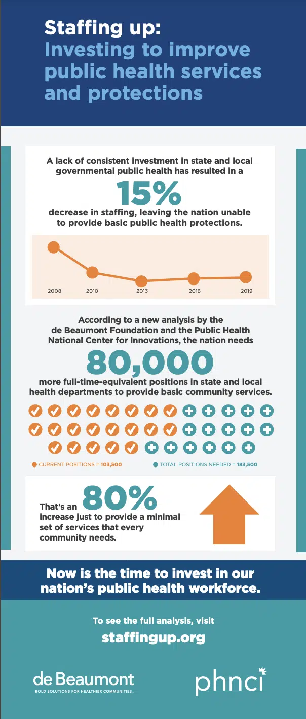 According to a new analysis, state and local health departments need to hire a minimum of 80,000 more full-time equivalent positions (FTEs) — an increase of nearly 80% — to provide adequate infrastructure and a minimum package of public health services. Download the research brief, “Staffing Up: Workforce Levels Needed to Provide Basic Public Health Services.”